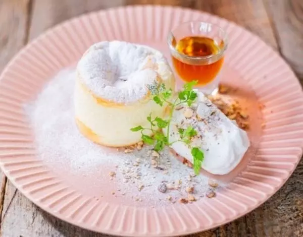 『まるでチーズケーキなようなパンケーキ』クリームチーズをたっぷり混ぜ込み、低温で焼き上げることで実現したまさに“飲めるパンケーキ”。生地の中にチーズソースが忍ばせてあり、カットするとトロ~リと流れ出てきます