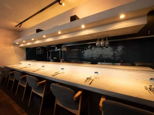 お店は、上乃裏通りのビル2F。シルバーのプレートに店名が書かれたシンプルなエントランスから中へ入ると、スタイリッシュ感とナチュラルな温かさが調和した空間が広がっています。ヨーロッパの意匠材で仕上げたカウンターには、わずか6席だけが用意され、ゆったりとくつろげるスペースに。本格フレンチをカジュアルに楽しめる空気感も心地いい、行きつけにしたい一軒です。