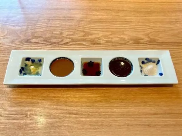 最初に、大根やニンジンのスティック、ミニトマト、キャベツ、蓮根チップと、5種類のソースがテーブルに。最初の串が登場するまでや、串と串の間の箸休めとしてお好みのソースをつけていただきます。ソースは右から、沖縄県の天日塩と京都の山椒を使った「山椒塩」、高麗人参やウコンなど30種類以上の食材や漢方からつくる「特製ソース」、中央が「自家製の合わせ醤油」、特製ソースをベースに胡麻とからしを使った「東京限定ソース」、シンプルな「からしとレモン」です。