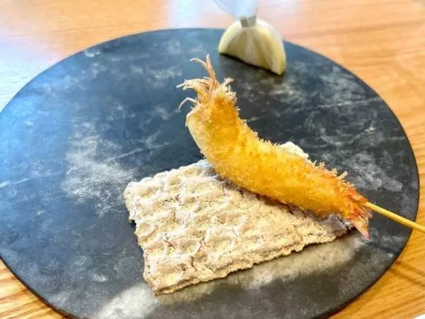 最初に提供されるのは「活車海老」。津田氏曰く「鮮度の良さが伝わる名刺代わりの1本です」。提供する直前まで、車海老はレモン水に入れ、氷で締めています。山椒塩とレモンでいただくのですが、レモンは種が落ちないよう工夫されている細やかな心遣いもさすが。
