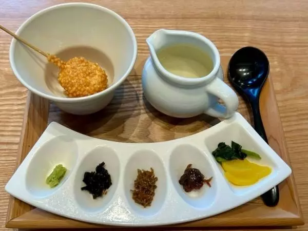 あられをまぶしたご飯を串から抜き、上品な風味のだしを注いでいただきます。徐々に崩しながら、手前に並ぶ山葵や佃煮などを入れると、違った味わいに変化。こちらは、もともと津田氏のお母さまが来店時に召し上がっていた裏メニューで、それを見た他のゲストから食べたいという声が多く7年ほど前から正式なメニューになりました。