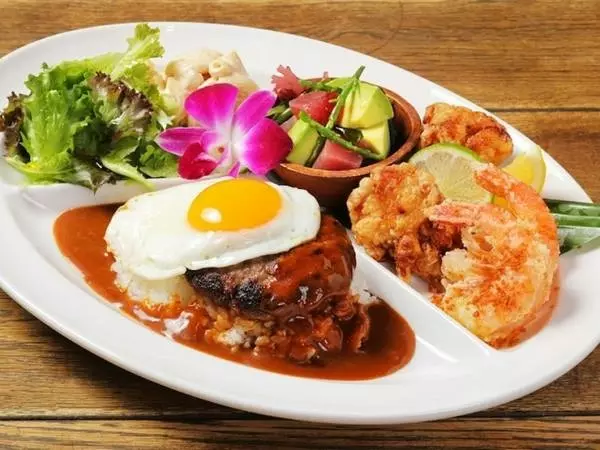 『ロコモコ』や『ガーリックシュリンプ』などのハワイのローカルフードが味わえます。
