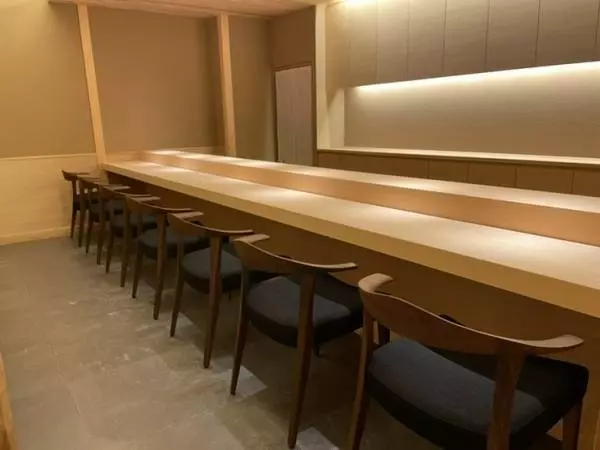 長野駅から善光寺へと続く表参道沿いに佇む、東京で修業した店主による鮨店。凛とした小路の石畳を進み温かな灯りに照らされた入り口を入ると、こだわりの木曽檜の一枚板でできたカウンター席がお出迎え。