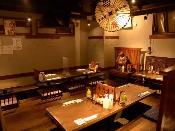 錦糸町駅より徒歩3分、四季折々の厳選食材を使った天ぷらや江戸料理をいただけます。店名の通り「江戸」をテーマに、江戸時代を彷彿とさせるインテリアに囲まれたまるでテーマパークのような空間。木のぬくもりあふれる店内には、立ち呑みカウンターと掘りごたつのテーブル席があります。