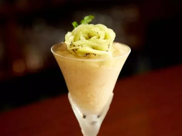 キウイをバラの花に仕立てるなど、デコレーションにも凝ったカクテル
