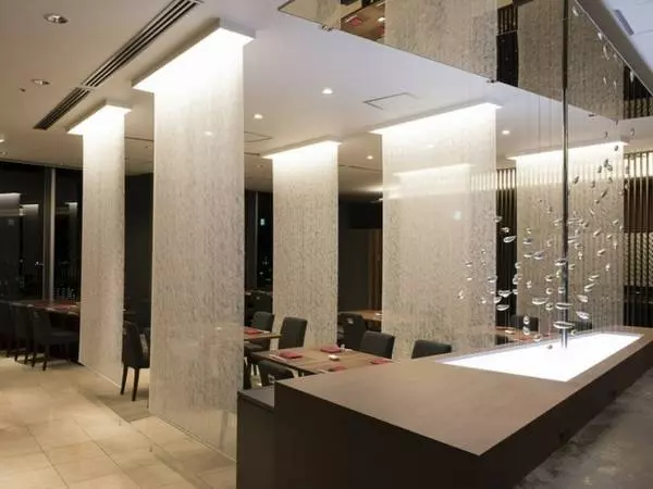 ホテル最上階とあって、窓側の席からの眺めは抜群。昼は岡山の街が一望でき、ディナータイムは夜景を眺めながら、岡山県産のワインや地酒と会席料理とのペアリングも楽しめます。和モダンで落ち着いた雰囲気の店内には、開放感あふれるホール席、カウンター席に加え、掘りごたつ式の和室とテーブル席の個室も完備されています。