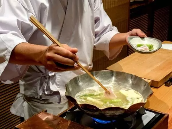 のどぐろのアラを5時間煮込んだ出汁を使用した、身体に旨みが染み渡るような一品。レアの状態に仕上げたのどぐろしゃぶを、柚子と酢橘の香りとともにいただきます。こちらも全てのコースで楽しむことができます