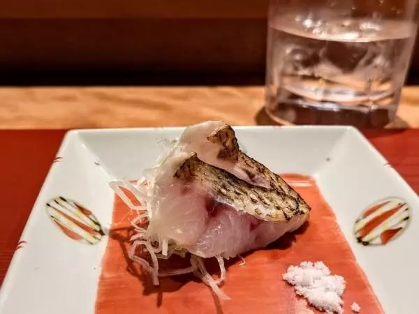 半身まるごと使用したお店自慢の塩焼き。全てのコースに付いています。溢れ出る旨みに驚く一品で、対馬産の塩との相性も抜群、皮ごといただきます。のどぐろの上品な脂により、食後感が重くならないのも嬉しいところです