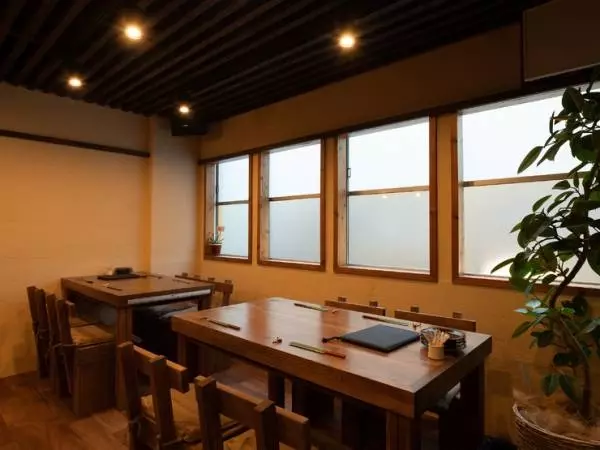 扉を開けると、入り口のすぐそばに囲炉裏が置かれています。ほのかに漂う備長炭の香りや、食材が焼ける音、香ばしい味わいなど五感で楽しめるのが、炭火焼きの醍醐味です。ウッド調で統一された店内は、洗練された和モダンな空間。カウンター席とテーブル席があり、お一人様でもグループでも訪れやすい雰囲気も魅力です。