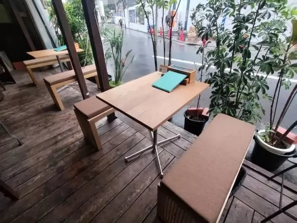 お店があるのは、東急東横線の線路跡に整備された、東横フラワー緑道のすぐそば。緑に覆われたオシャレな外観が目印です。開放的で、一人でも立ち寄りやすい雰囲気。ペット同伴も可能で、犬用のおやつや専用ソファも用意されています。雨や肌寒い日にはカーテンでカバーされ、日除けも万全なので、天候に関わらず気軽に利用できます。