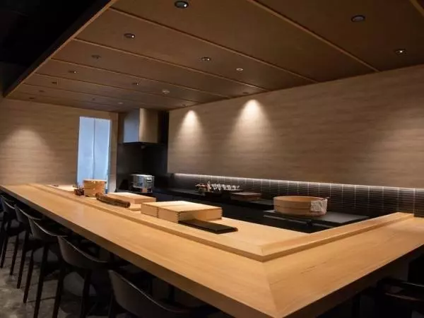 三宮駅より徒歩4分の場所にある、カウンター席のみの鮨店。黒が効果的に使われた和モダンな雰囲気の店内は、照明を落とした落ち着いた空間。奈良の西吉野まで直接足を運んで選んだという檜でつくられたカウンターは、視線を遮るものがないフラットな設計で職人の所作を楽しめます。