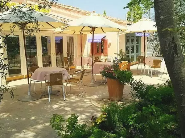 オリーブなどの木々に囲まれた南欧風のお店。気候のいい時期はぜひテラス席で