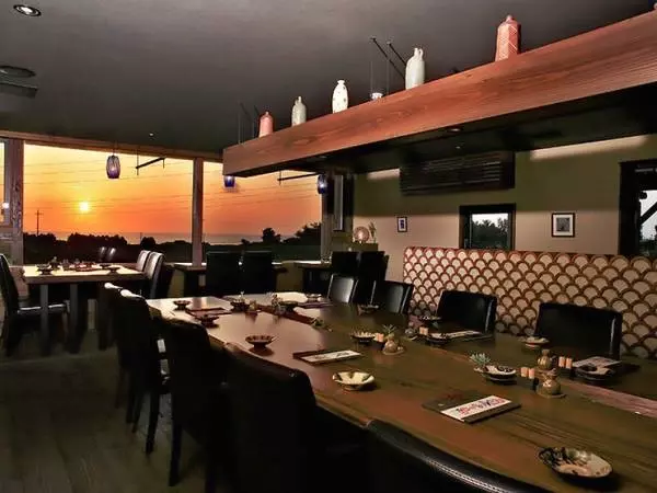 その名の通り、青い海と青い空、夕日と、抜群のロケーションの中で食事ができる隠れ家ダイニング。ウッド調の広々とした店内は、ゆったりと落ち着ける空間で、疲れた心と体を癒してくれます。1人でも気軽に利用できるカウンター席に加え、開放感あふれるテラス席やテーブル席、落ち着いた個室も完備。