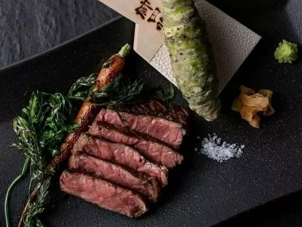 岩塩、生胡椒、わさび、泡醤油の4種の薬味で味わう『シャトーブリアンの鉄板焼き』