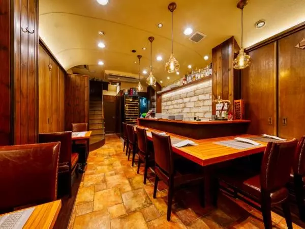 同店は四ツ橋筋から一本西の路地に佇む、一軒家レストランです。中に入ると、木を基調とした温かみのある空間が広がっています。アンティーク家具やステンドグラスが、非日常感を演出。高級感が漂いながらも、くつろげる雰囲気です。1Fはカウンター席と2名用のテーブル席、2Fは6名まで利用可能な個室になっていて、大人のカジュアルデートにおあつらえ向きです。