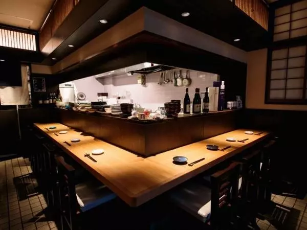 九品仏駅より徒歩5分、九品仏商店街の外れに佇む落ち着いた和食店。店内は木目調の内装が心地よく、美術館の照明をイメージしたライティングも素敵です。オープンキッチンを囲むカウンター席は、調理のライブ感が楽しめる特等席。
