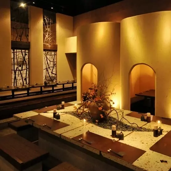 お店はネオクラシカルジャパネスクがテーマ。木・鉄・大理石の素材感を活かし、モダンの中に温かみのある空間を演出。接待や家族連れに最適な和個室・洋個室、二人連れには大テーブルとカウンター、大人数の宴席にも対応できる開放的な小上がり席などシーンに応じた席を多数用意しています。