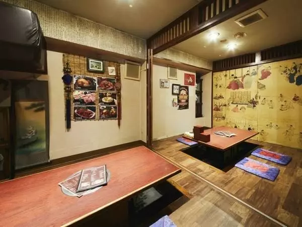 店内は古き良き韓国の古民家をイメージ。2~6名のお座敷の掘りごたつ個室の中は広めに席をとってあるので、ゆったりくつろげます。テーブル席はつなげて最大18名の利用が可能。
