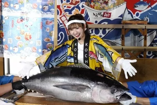 また、高知県出身で高知県観光特使も務めるアイドルグループ「アンジュルム」の川村文乃さんが登壇。おすすめの高知の食べ物は「やっぱりカツオ!なかでも、丸宗田(ソウダガツオ)の生まれて一年未満のお魚の「新子」がおすすめです。」など高知にまつわるトークのあと、女性としては初の「1級マグロ解体師」有資格者として40kg級のマグロを豪快に解体しました。