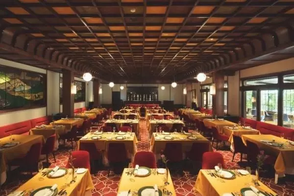 ホテルを象徴する和洋折衷の空間「メインダイニングルーム」。折り上げ格天井や柱など、昭和初期の建具が再利用されており、随所でホテルの歴史を感じることができます