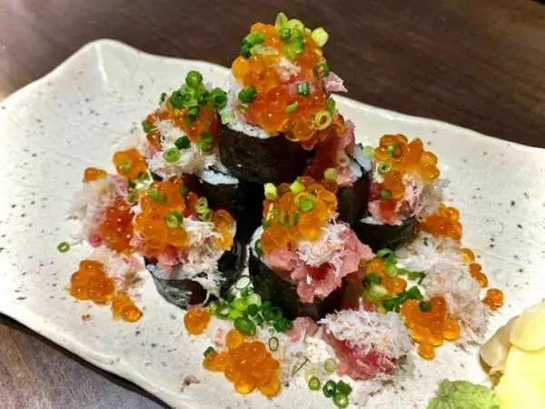 三崎港買参権を自社で取り扱っているため、他店では味わえないような食材を手軽な価格で楽しめます。ネギトロ、紅ズワイ蟹、イクラを盛付けた『こぼれ巻き寿司』など、コストを度外視した逸品が並びます。全国から選りすぐった地酒は、日本酒好きも唸るラインアップ。