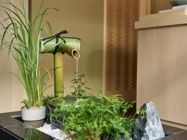 店内中央に飾られている、古来の坪庭に見立てたつくばい。随所に施されたおもてなしの気持ちに触れ、ふと、心が温かくなります