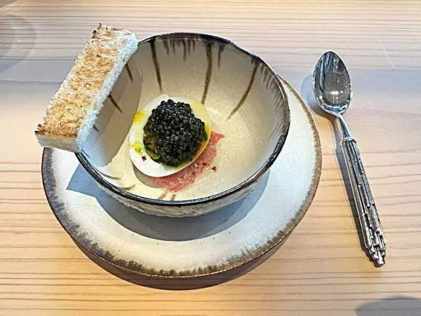 「トロマヨです」とヤニック・アレノ氏が出してくれた3品目は、まさにそれで、トロの上には茹で卵とキャビア。焼いたトーストが添えられています。キャビアとトロの濃厚な深みとソースの酸味がしっかり感じられます。週2回は鮨を食べるというほど鮨好きのヤニック・アレノ氏ですが、相当いろんな名店を食べ歩いてもいるようで、銀座の鮨水谷には2週間に渡って通ったという話も。