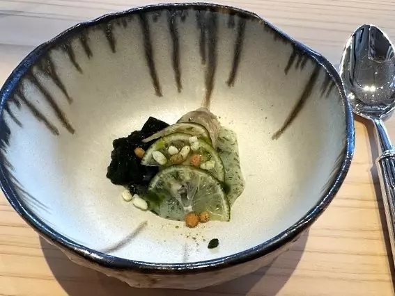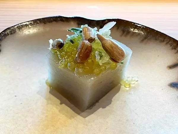 2品目はアーティチョークの豆腐で、ピューレを葛で練ったものが使われています。薫香のついたカワカマスの卵が乗せられ、胡麻豆腐のような感覚です。青のりが入った揚げ玉が隠し味で、このカリカリとした食感がまた面白い。
