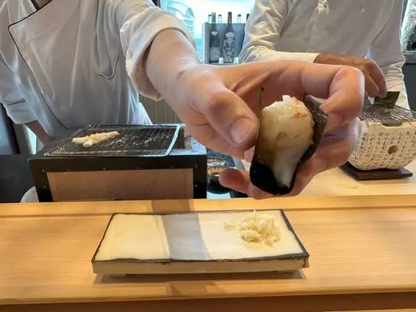 箸休めの豆腐の後に焼き台が出てきて、目の前で海老が焼かれます。「ボタンエビです。フランスの店だとこれが手長エビになるんですが、レアに焼いて炙った海苔で巻いて手渡しします」と安田料理長。