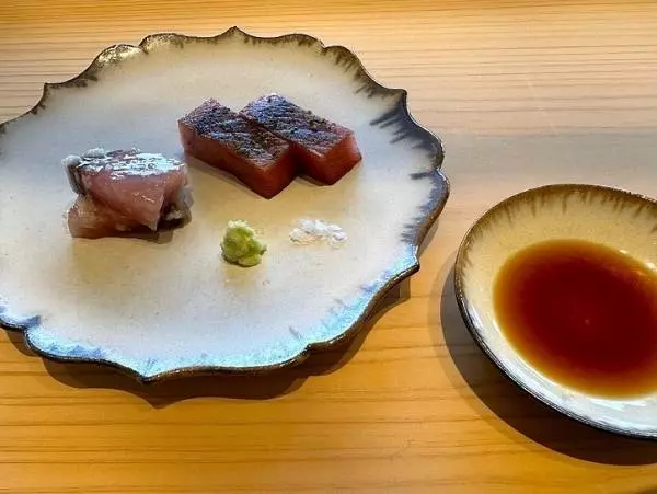 前菜の最後は刺身です。ブリの塩こうじ漬と中トロですが、トロは炭で炙って青柚子の粉がかかっています。安田料理長が出してくれました。
