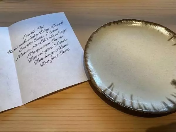 さて、メインの鮨の時間です。カウンターひとりひとりにカードが配られ、開くとそこに本日のネタが書いてあります。安田料理長が握り始めます。
