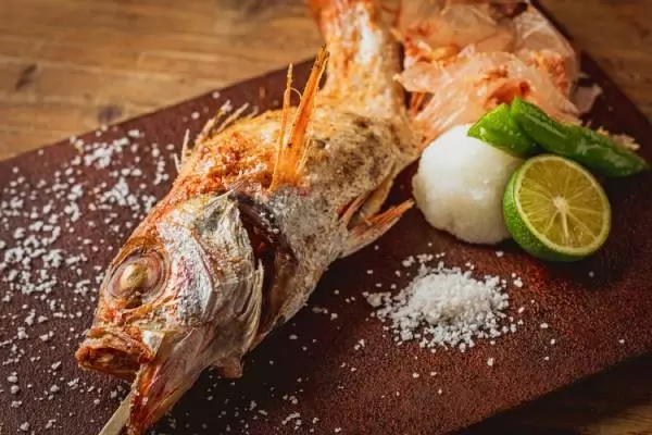 『原始焼き・のど黒』3,500円。この日ののど黒は島根県から直送されたもの。『原始焼き』は、旬の魚を炭火で焼き上げる、【創和堂】の名物メニュー。丸ごと一尾串に刺し、炭火の遠火で焼き上げる。皮は香ばしく、適度に脂が乗った身はふっくら