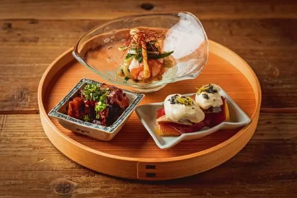 『わっぱ盛り・おばん菜』1,800円。おすすめのおばん菜からセレクトされた3種の盛り合わせ。基本的には2人用でシェアするスタイル。この日は『牛すじとレンコンの八丁味噌あえ』『馬肉の生ハムと柿の白和え』『エビとニラ、ピーナツもやしのナムル』