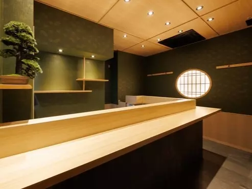美しい木のカウンターは料理人を囲むように取り付けられており、どの席を選んでも調理の臨場感を味わえる様子。日本家屋を思わせる違い棚や丸窓、盆栽が設えられており、それらが見える席を選びます。
