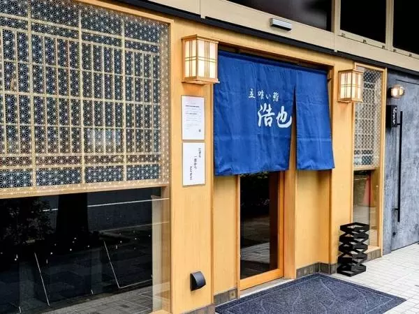大門駅から徒歩1分。明るい和風づくりの外観に、【立喰い鮨 浩也】の店名が入った紺色の暖簾が静かにゆれています。