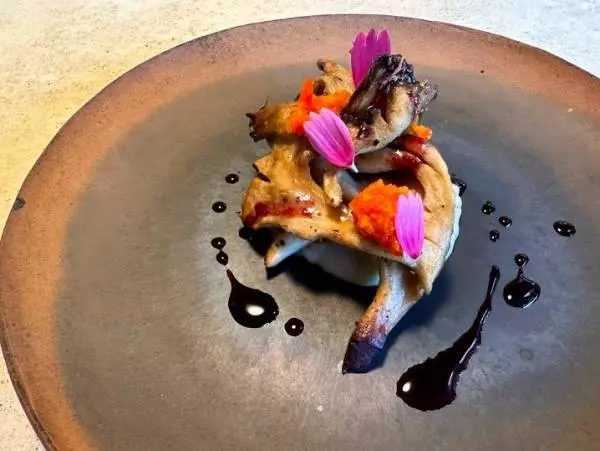 3皿目に薪で焼いた天然マイタケが来ました。麦のリゾットが敷かれています。香ばしい香りがします。やまぶどうのソースとパプリカやニンジンをすったものが添えられて味のハーモニーが完成します。マイタケに独特のフレッシュな食感が残っていて、大地を感じます。