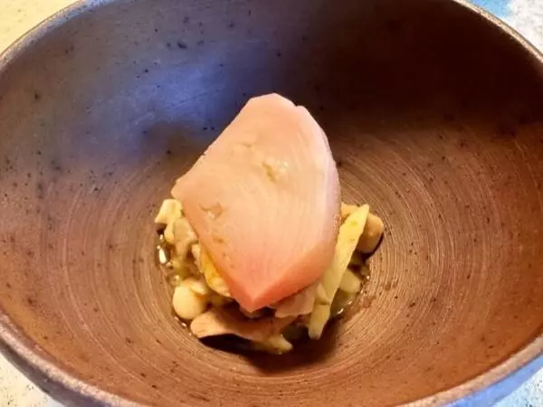 桃のような蕪「もものすけ」は3時間くらいかけてじっくり蒸されており、さっぱりめのもつとよく合います。インゲンやマコモダケの食感もいい。