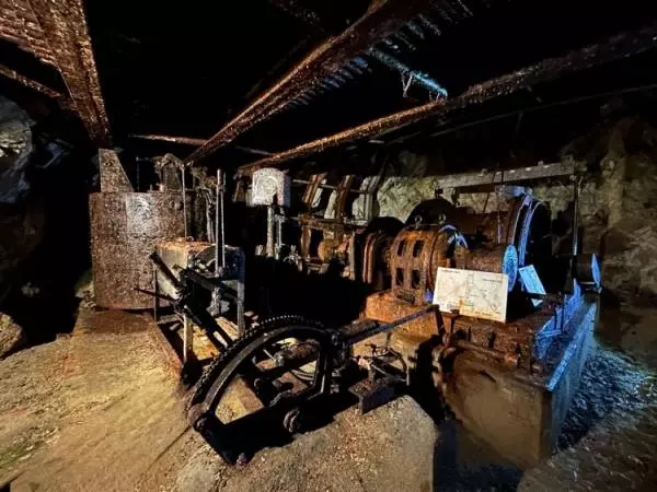 坑洞内には、実際に金の採掘に使用されていた機械が展示されています