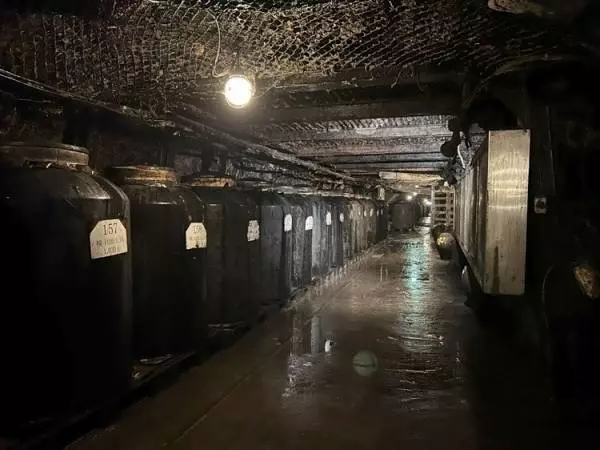 坑洞の奥まで1000ℓのかめがずらりと並みます。ここでは「薩摩焼酎 金山蔵」「薩摩焼酎 金山蔵 RED」などがつくられています