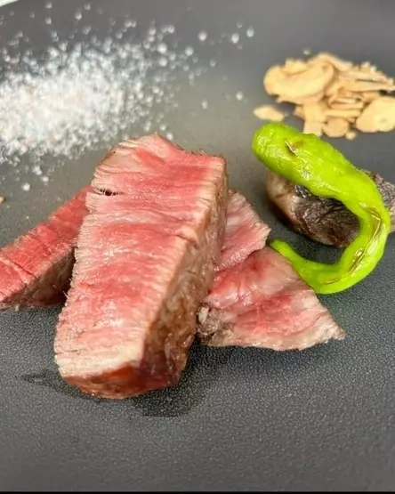 ソムリエでもある川口氏の神戸牛に対するこだわりは、調理工程から始まります。紀州備長炭を使い、炭の香を纏うように焼き上げる神戸牛のステーキは、肉の旨みを最大限まで引き出します。