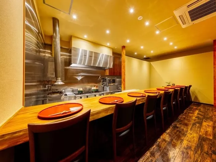 カウンター越しに一品一品丁寧につくられ、調理風景や漂う薫りなど目や鼻でも料理を楽しめます。また、要相談でコースのお値段やコース内容を変えることも可能。カウンター席のみの店内はゆったりと落ち着いた雰囲気を醸し出しています。少人数でのお祝い事や宴会で貸し切りも可能です。