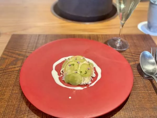 蓮根のピクルスと兵庫県産の香住(かすみ)ガニを和えたタルタル、その上にシャインマスカット、エルダーフラワーのシート、ソースは自家製のアーモンドミルクソースです。ピクルスの酸味とマスカットの甘味、香住ガニの優しい旨みが調和してとても華やかな味わいが印象的。