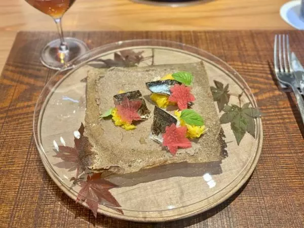 前菜2皿目は秋刀魚のクレープ。秋刀魚だけでもそうですが、紅葉を思わせるお皿で秋の訪れを感じます
