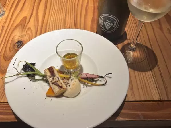 バーニャカウダは地元で西洋野菜をつくっている農家のネギやカブ、紅芯大根などが持つ力強い味わいを堪能できます。ペアリングには、あきる野産のモンドブリエを100%使用した「ヴィンヤード多摩」の白ワインを合わせます。