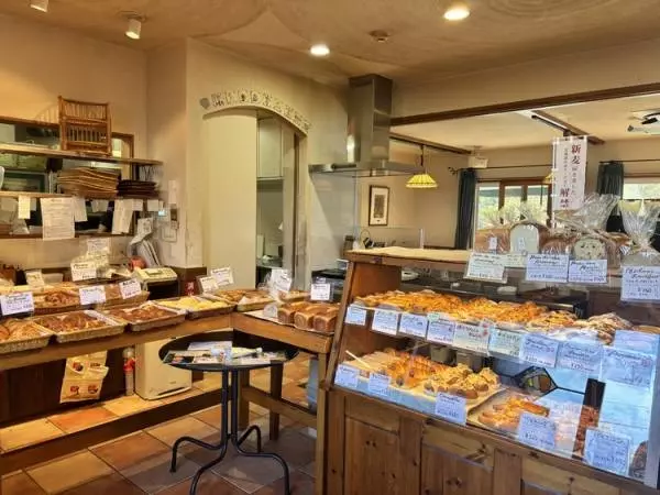 フランスパンなどのベーシックなものから地元の旬食材を使った季節ものまで幅広いラインアップ。買ったパンを持ち帰るのはもちろん、奥のカフェスペースでいただくこともできるほか、11時から14時の間はスープやマリネなどがついたランチメニューも用意しています。