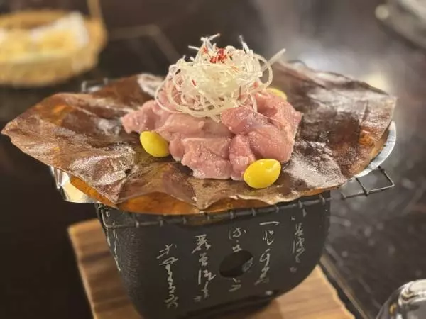 あやめコースからの一品『若鶏朴葉焼』。ほろ苦い味噌と絡めて焼き上げます