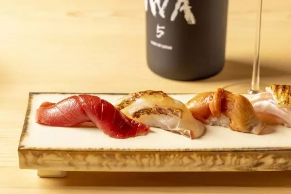前菜に続いて握り。プリプリのアジからスタートし、身の締まったタイ、炭が香るとろけるカマス、昆布の旨みと歯応えがたまらないヒラメの昆布〆と、どの握りもエレガントな印象です。そんな鮨を引き立てる日本酒は、IWAや九平次がサーブされます。