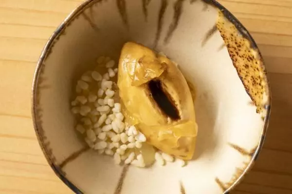 白味噌を焦がしたコク深いアイスクリームです。かぶのコンフィチュール、中央はマッシュルームからつくったキャラメルソース、ポン菓子、下には柚子のゼリーを忍ばせていて、やはりこの一皿からも日本とフランス、それぞれの要素を感じます。