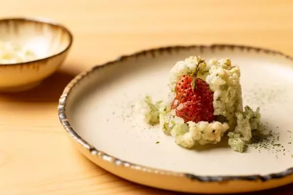 デザートは4品。青のりが入った砂糖でイチゴを包んで焼いた『イチゴの砂糖窯焼き』は、パスティスという八角が香るリキュールで香りづけされており、ウイキョウ(フェンネル)もアクセントになっています。別添えのサワークリームをお好みで。