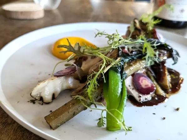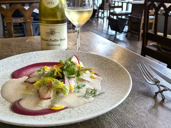 ある日の前菜『安穏芋のポタージュ/宇治ほうじ茶の香るミルクフォーム』。サーブして頂くなり、思わずわぁっと歓声をあげてしまった華やかな一皿です。口にした瞬間にいっぱいに広がるほうじ茶の香りと、まろやかなポターじゅとの掛け合わせが絶妙。芋チップスの優しい食感もアクセントになっています。濃厚なようで、前菜向きなサラッとしているこちらのポタージュは、華やかなブドウ感香るスパークリングとあわせて